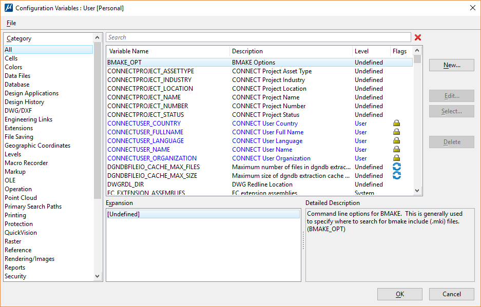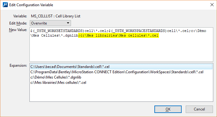 Il convient ensuite de s’assurer que la librairie de cellules est bien accessible par MicroStation. Pour cela, une autre variable de configuration doit être vérifiée : MS_CELLLIST.