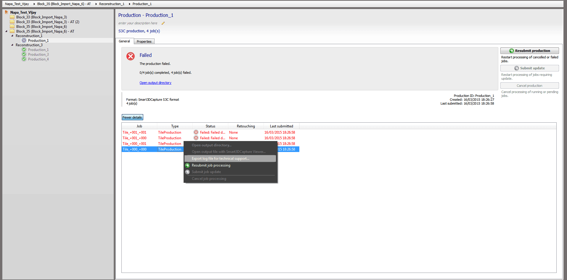 1. Si votre production a échoué, vous devez cliquer sur votre production dans la colonne de gauche.
