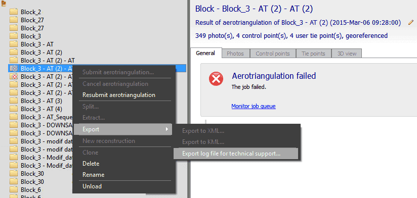 1. Votre processus d’aérotriangulation a échoué et vous ne savez pas pourquoi. Vous devrez exporter le fichier journal et l’envoyer à l’équipe de support Bentley iTwin Capture Modeler.