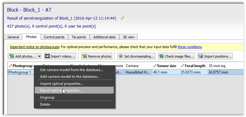 - Exportez les propriétés optiques du photogroupe aéro-triangulé.
