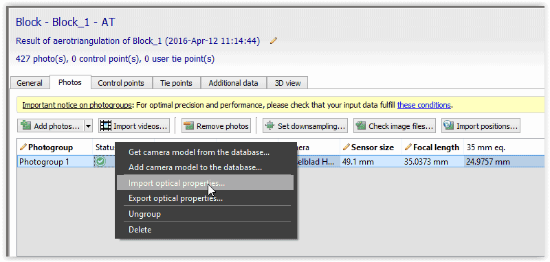 - Vous pouvez les importer sous forme de fichier * .opt en faisant un clic droit sur votre photogroup, avant de soumettre l’aérotriangulation.